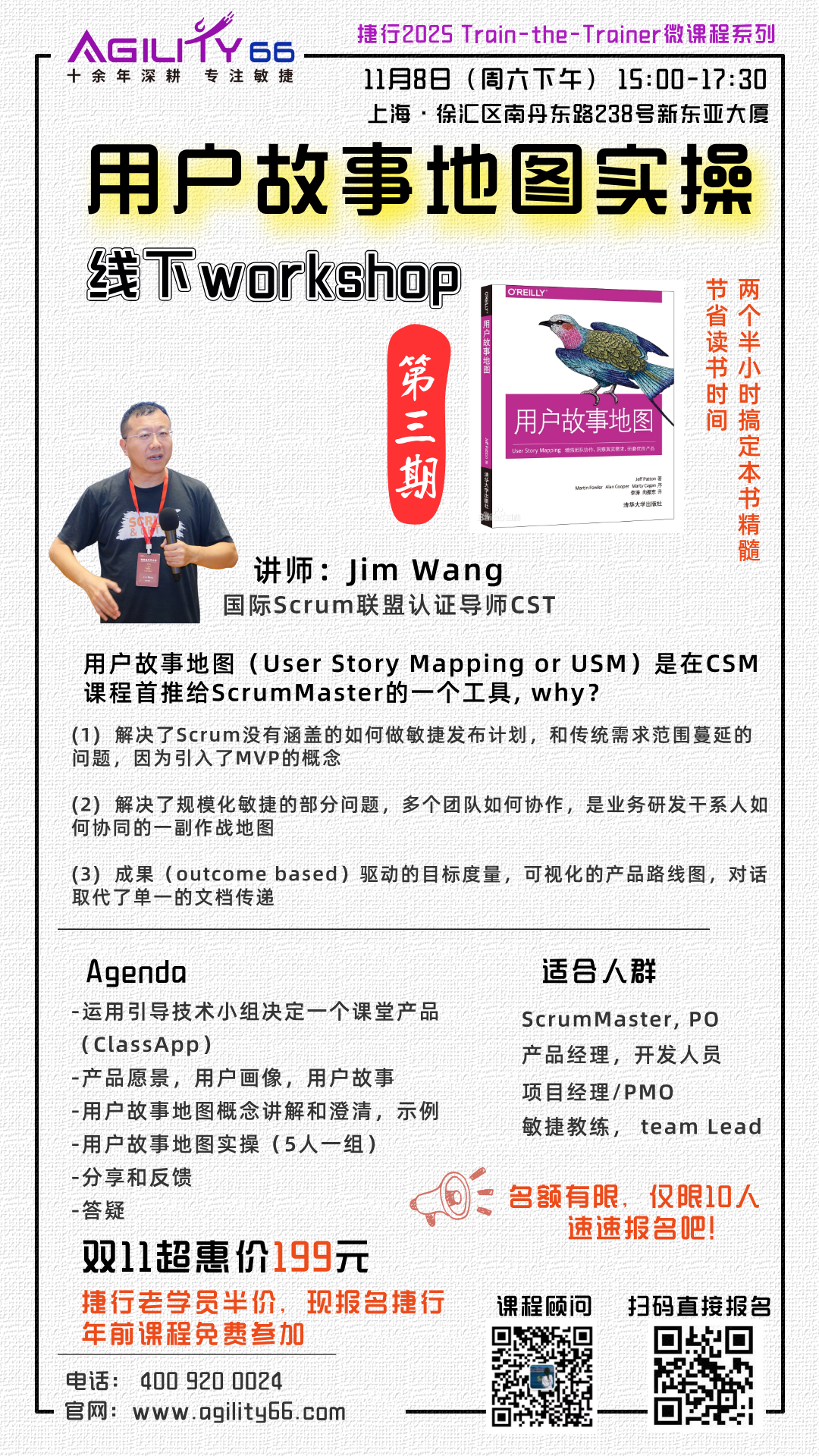 Jim与数十位国际知名的敏捷大师共同教学,包括Scrum的创始人Jeff Sutherland,原亚马逊首位ScrumMaster Alan Atlas,